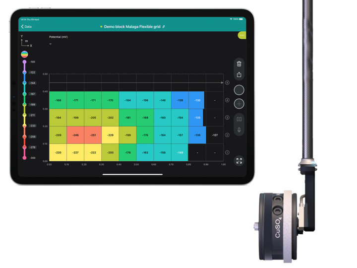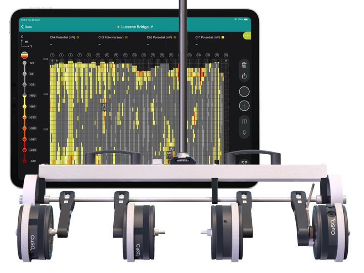기둥이나 보와 같은 작은 영역을 빠르게 스캔하기 위한 막대 전극을 포함하여 부식 가능성의 현장 매핑을 위한 완벽한 센서 및 소프트웨어 솔루션
